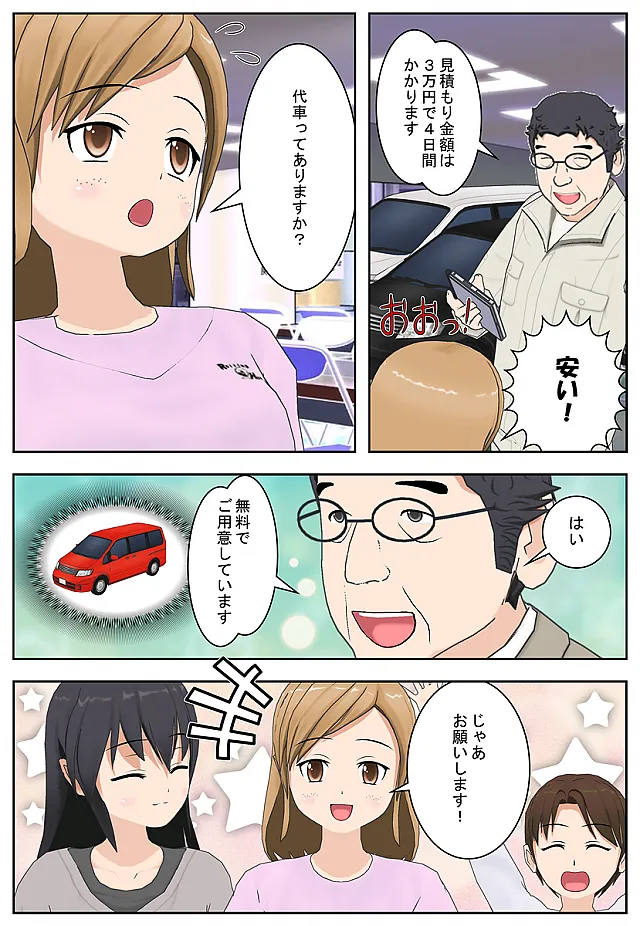かなり目立つヘコミとガリキズをつくってしまい、格好も悪かったので早々にお願いしました。すぐ、代車を無料で手配してくれたので、安心してお任せできました。